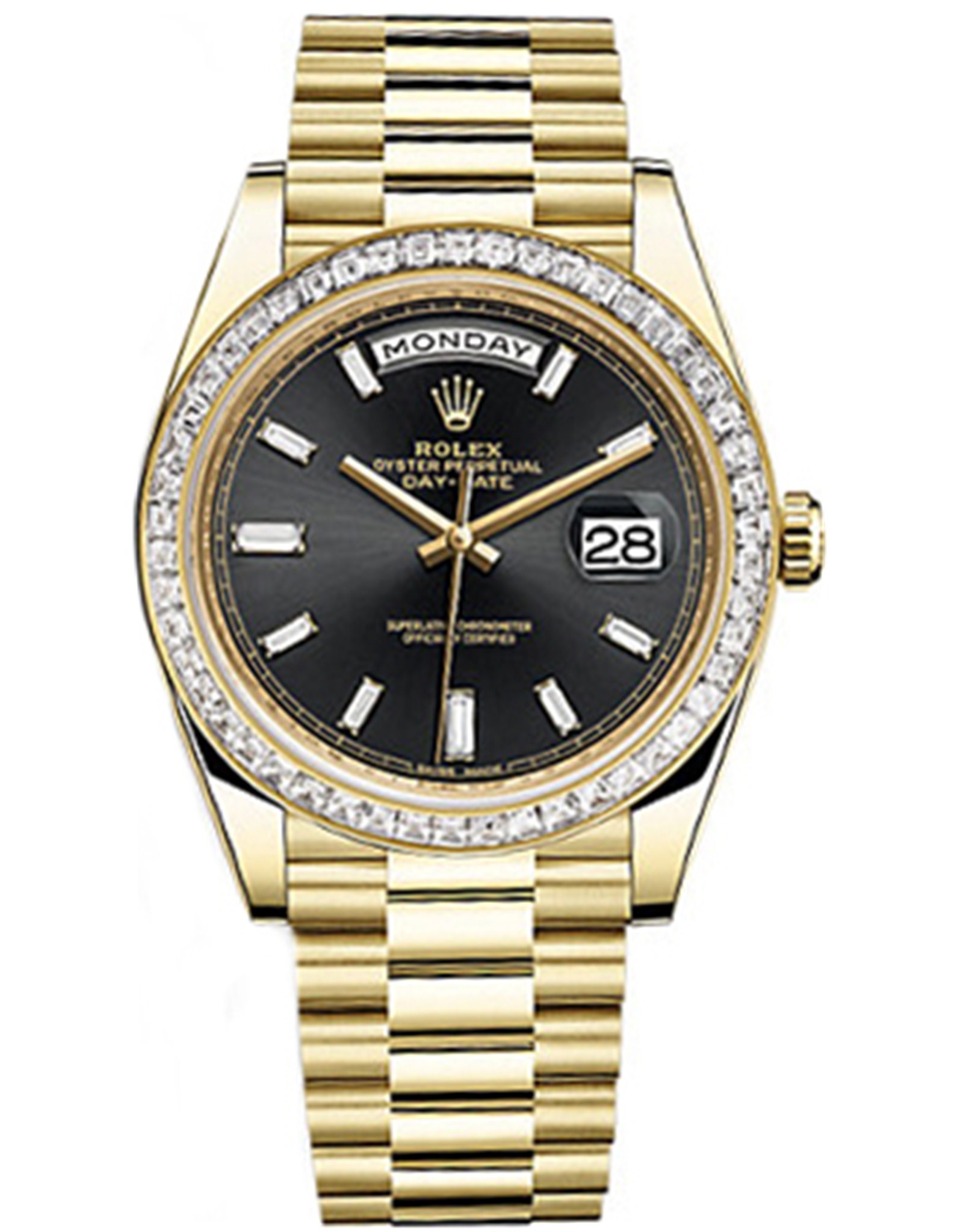 Replica Rolex Day Date Automatic watch Features Yellow Gold Case With Fluted Bezel Black 36 MM