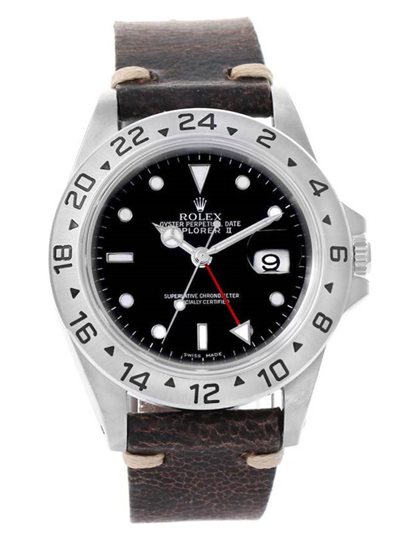 Replica Rolex Explorer II Mens Steel Black Dial Leather Strap Watch 16570 40MM