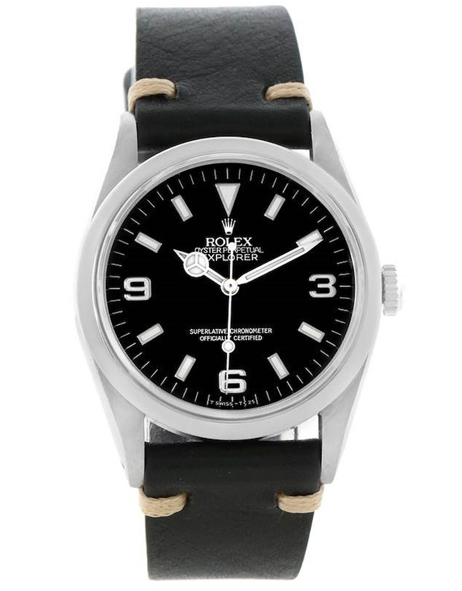 Replica Rolex Explorer I Mens Steel Black Leather Strap Watch 14270 36MM