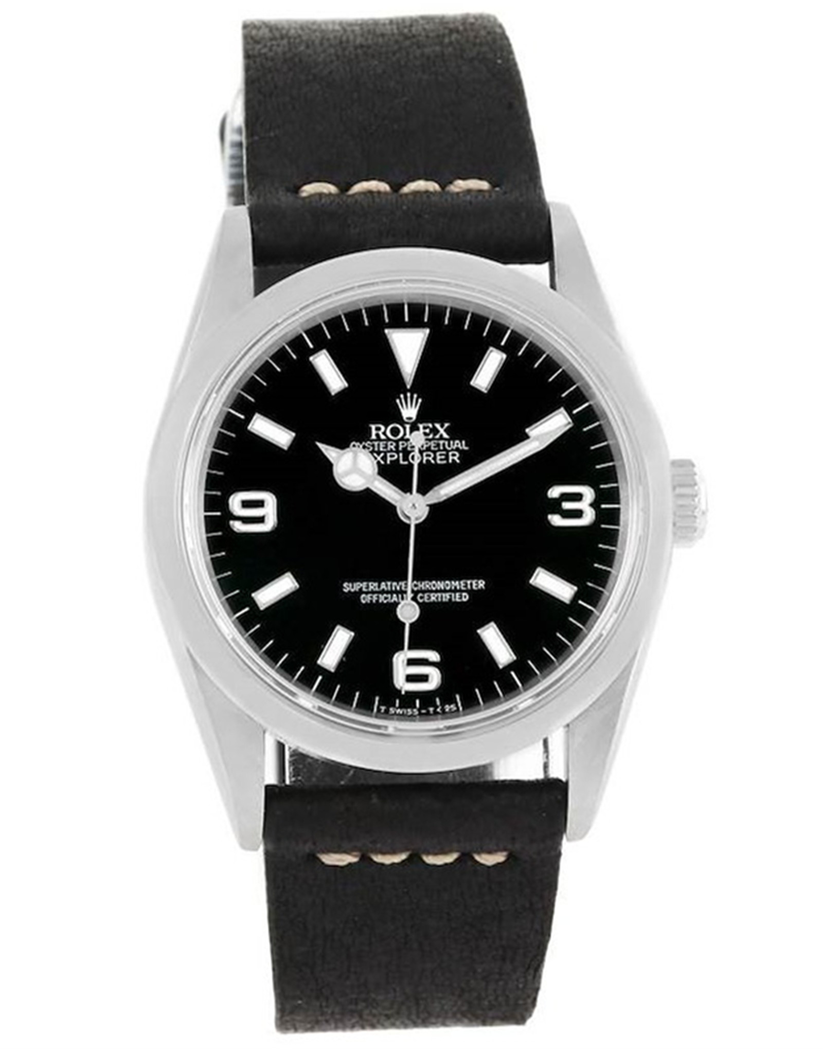 Replica Rolex Explorer I Mens Steel Black Dial Leather Strap Watch 14270 36MM