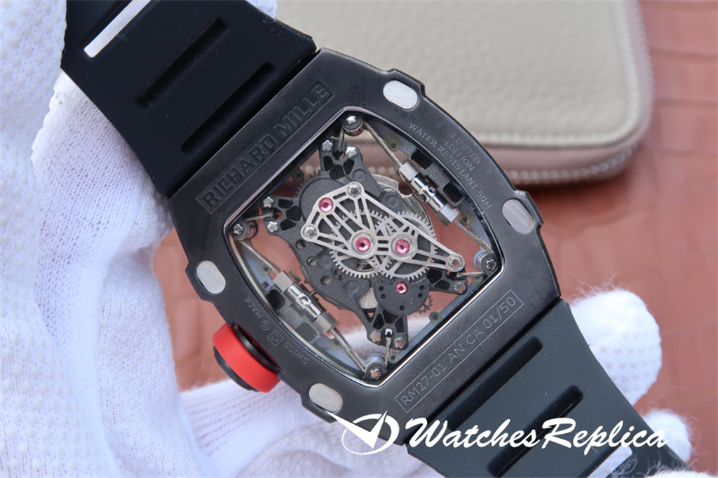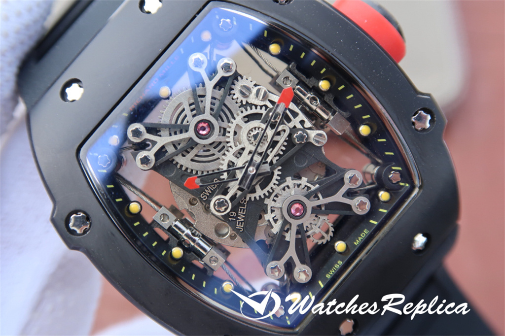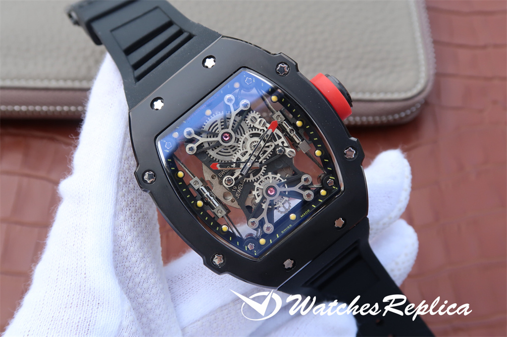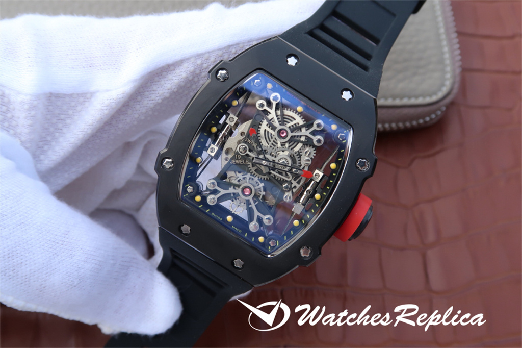 Richard Mille RM52-01 hollow skull watch. The classic wine barrel shape shell is made of new material zirconia polycrystalline ceramics, and it uses the advanced technology of nanometer anti-tarnish and anti-wear. The outline of the skull is prominent, the shape is domineering and unruly, with shocking charm. The hollow design, the gears fly between the dials, presenting the beauty of machinery. Luxurious and noble quality comes from size 43x50mm.