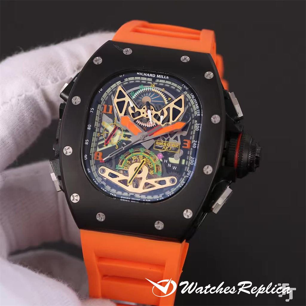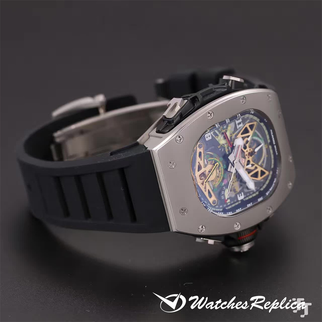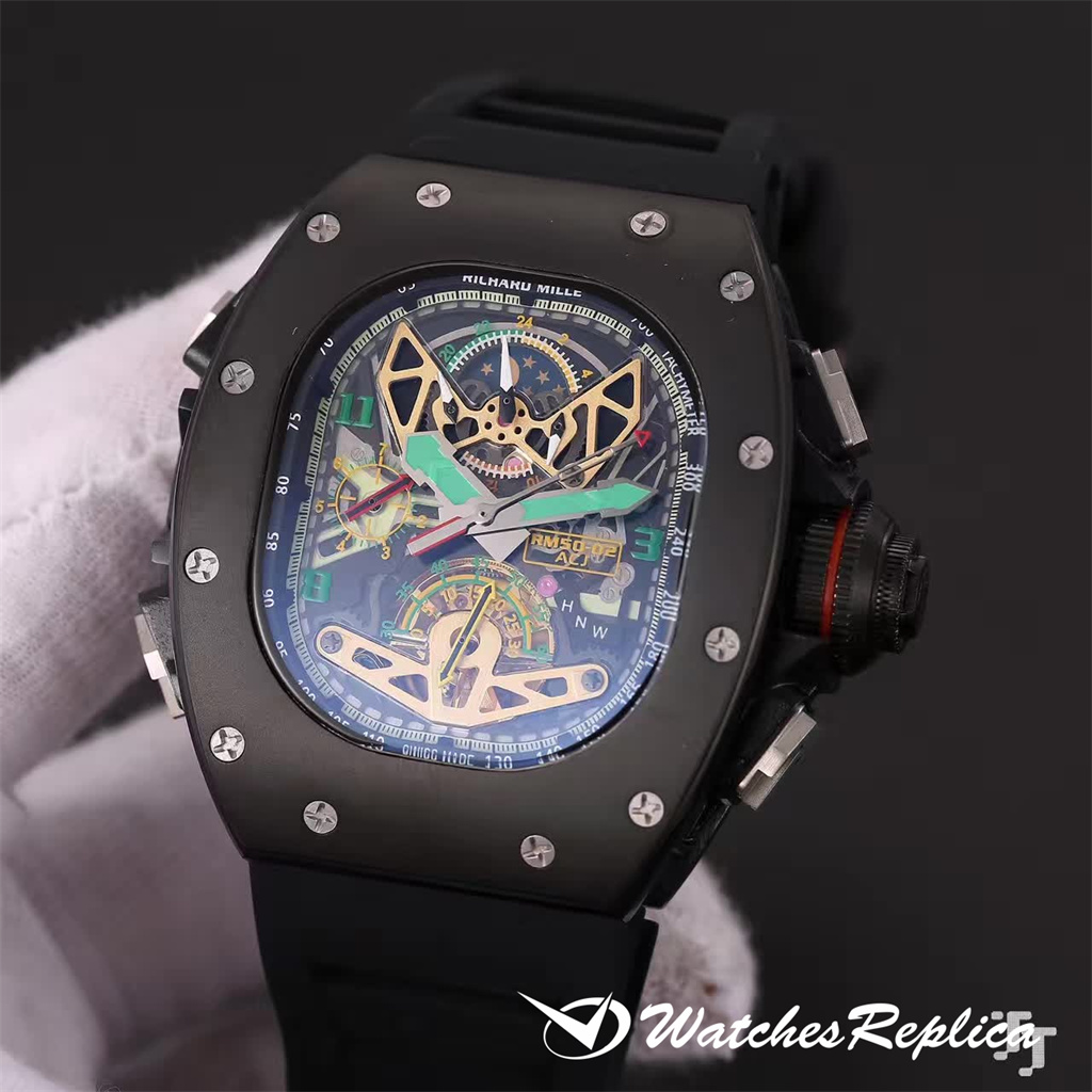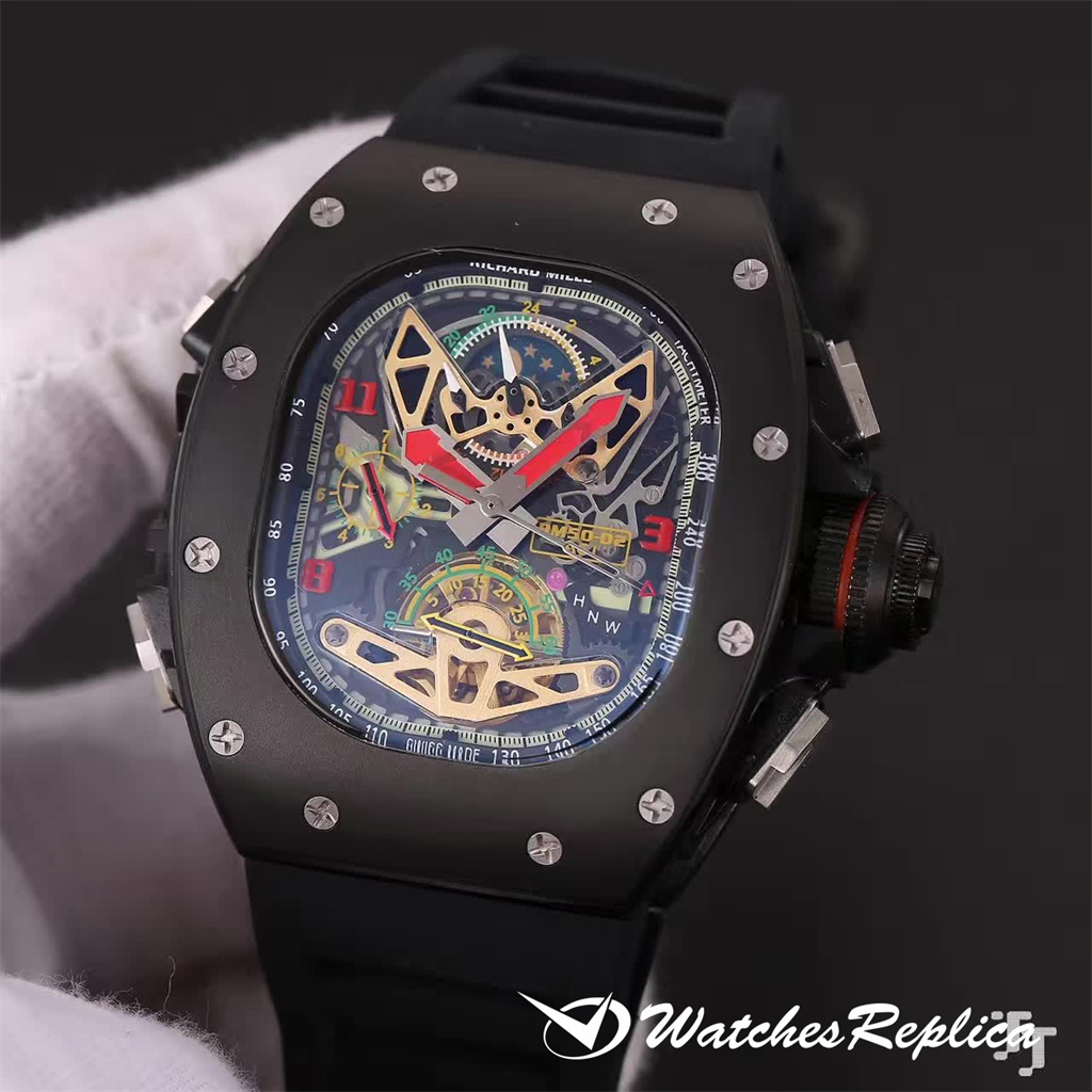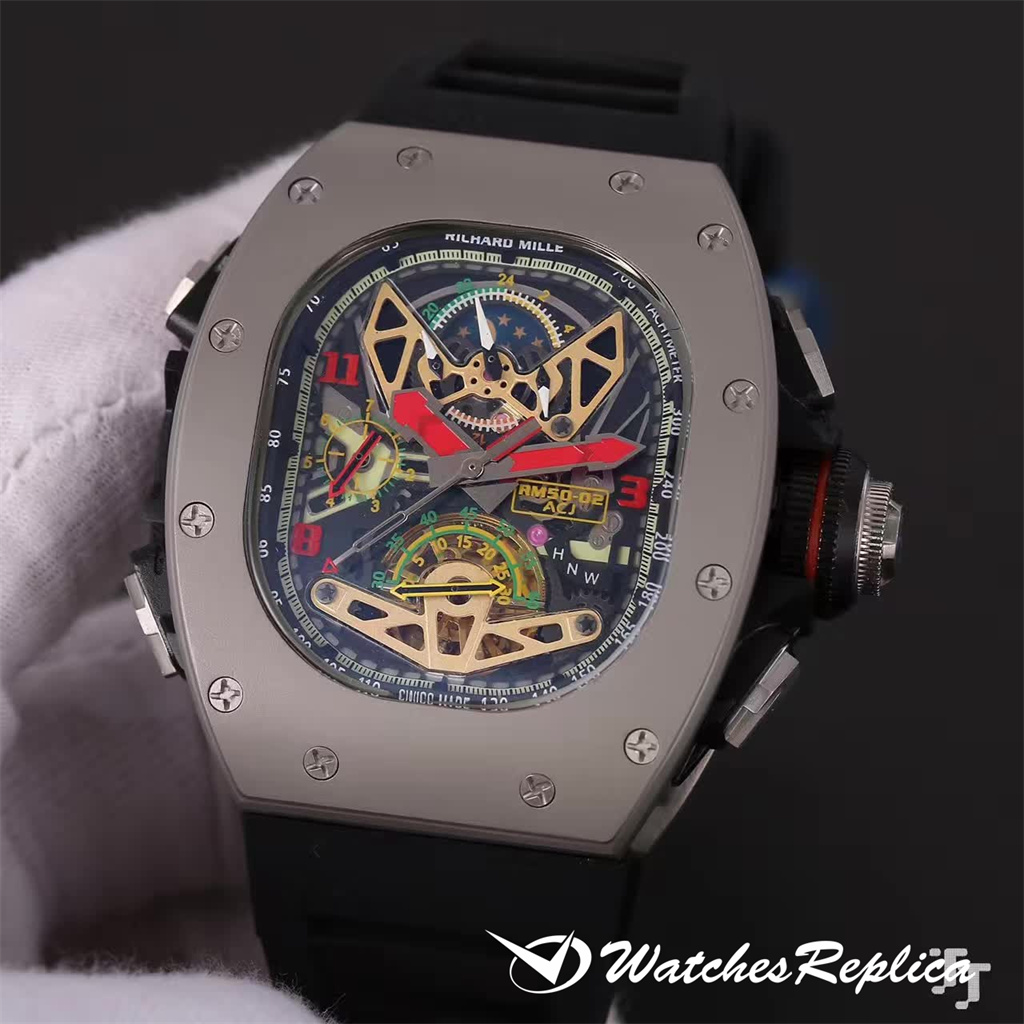 Richard Mille RM52-01 hollow skull watch. The classic wine barrel shape shell is made of new material zirconia polycrystalline ceramics, and it uses the advanced technology of nanometer anti-tarnish and anti-wear. The outline of the skull is prominent, the shape is domineering and unruly, with shocking charm. The hollow design, the gears fly between the dials, presenting the beauty of machinery. Luxury and noble quality comes from size 43x50mm