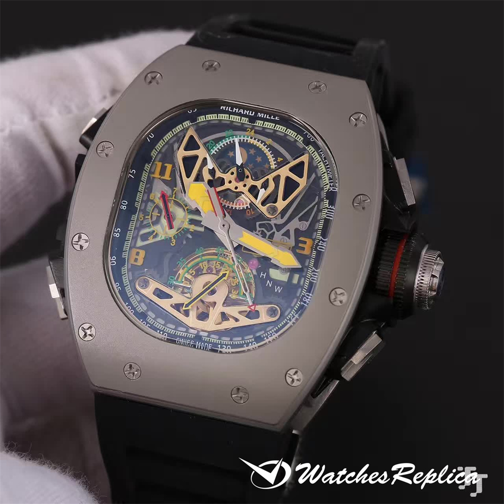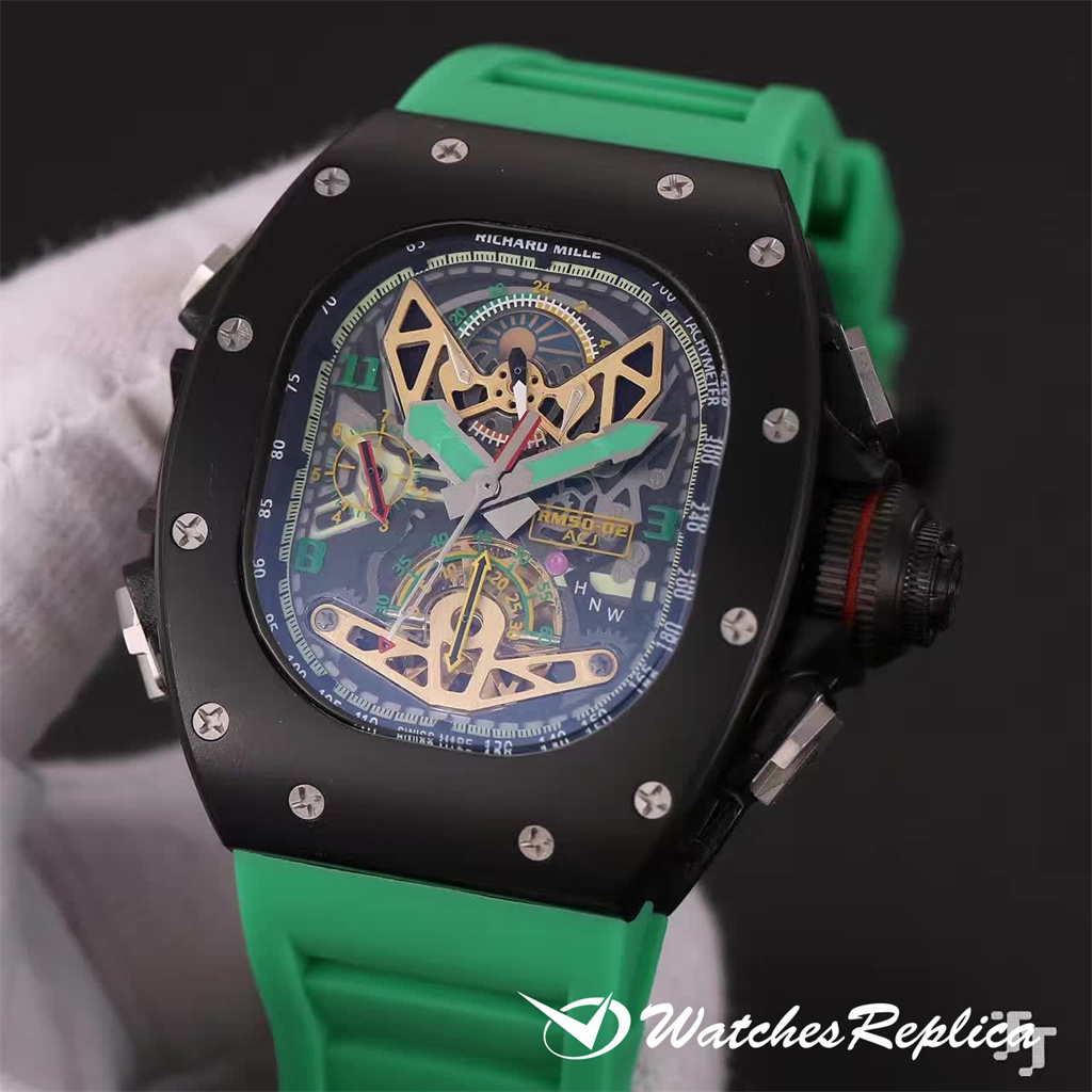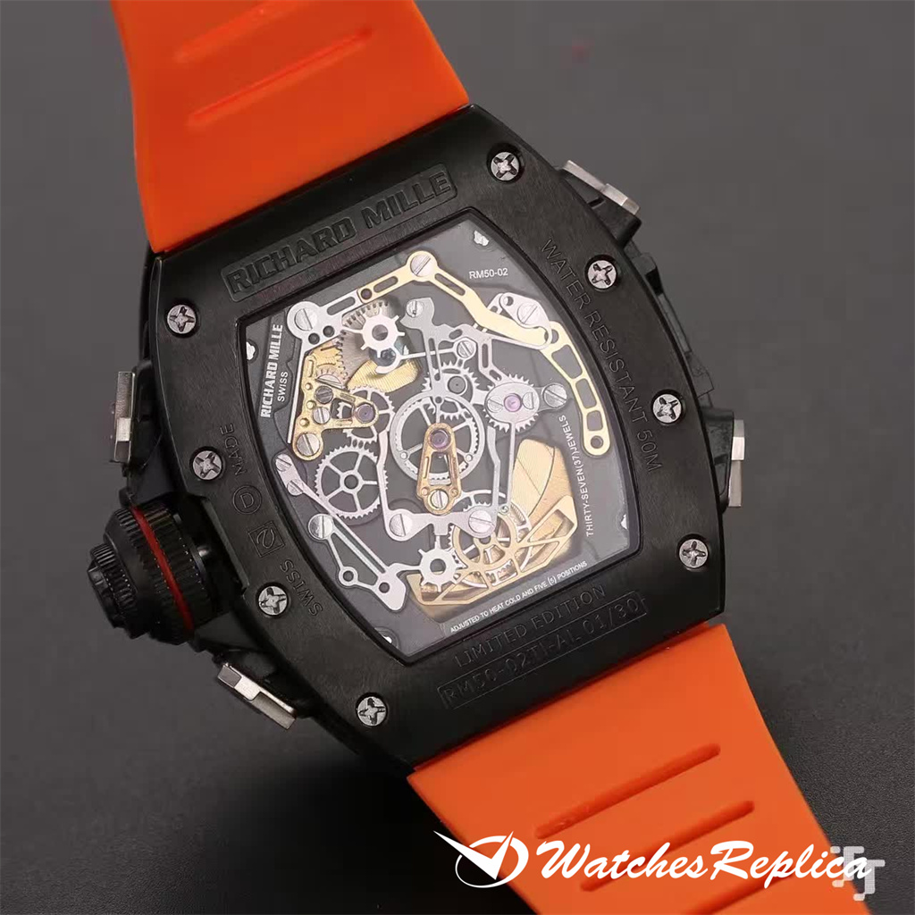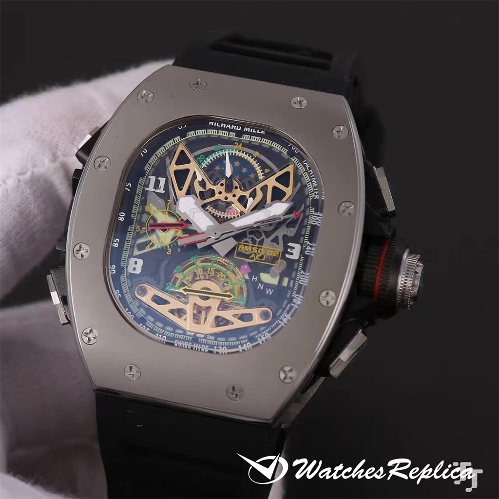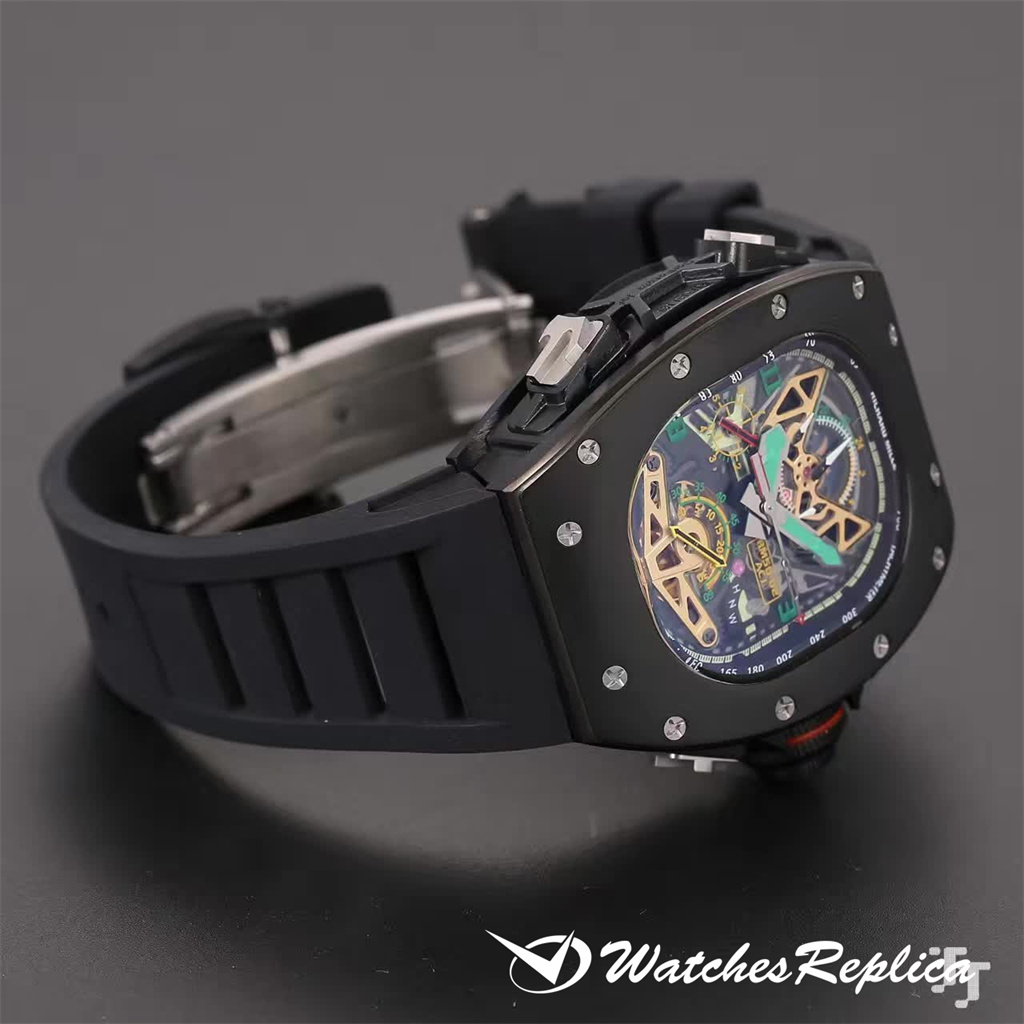 Richard Mille RM52-01 hollow skull watch. The classic wine barrel shape shell is made of new material zirconia polycrystalline ceramics, and it uses the advanced technology of nanometer anti-tarnish and anti-wear. The outline of the skull is prominent, the shape is domineering and unruly, with shocking charm. The hollow design, the gears fly between the dials, presenting the beauty of machinery. Luxury and noble quality comes from size 43x50mm
