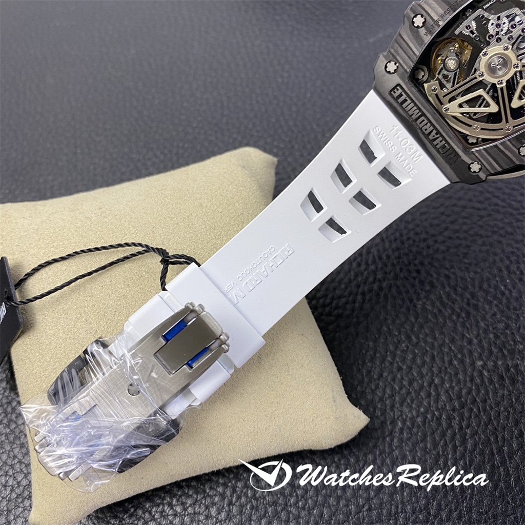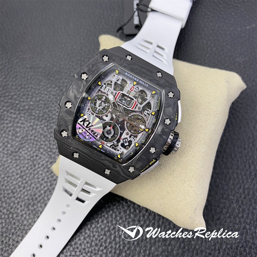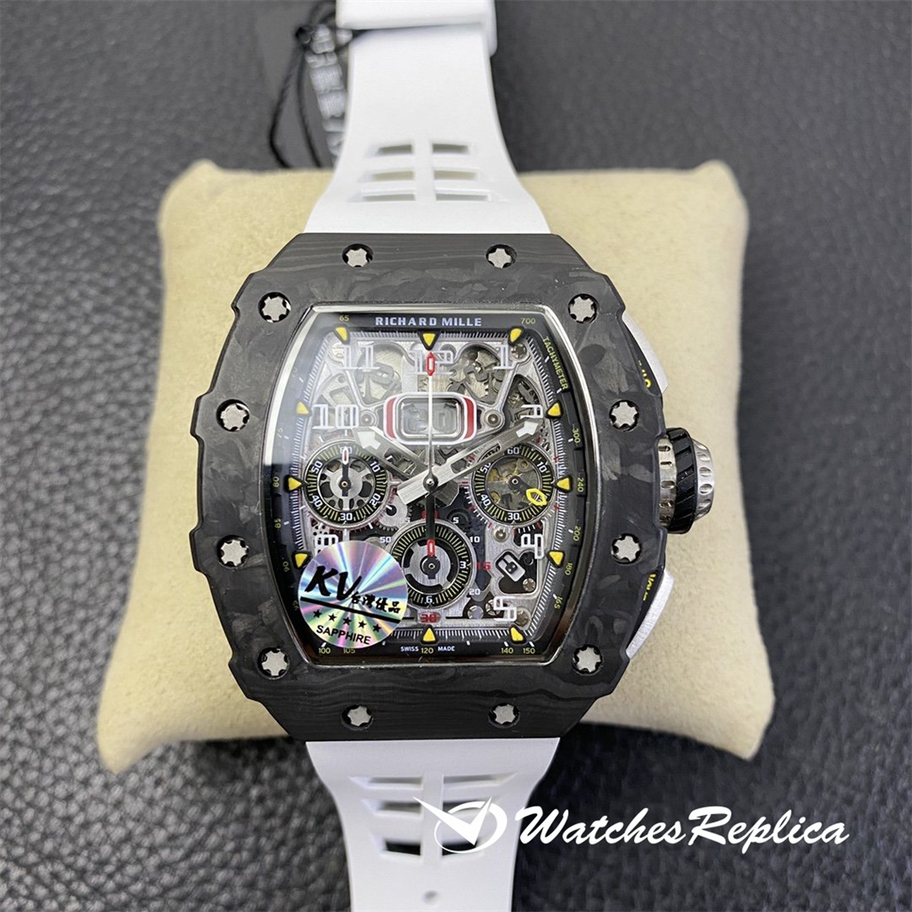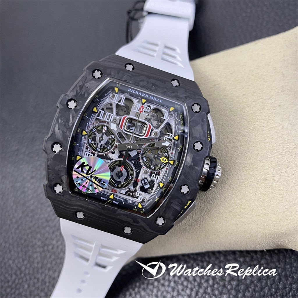 The overall design of the Richard Mille RM010 dial is classic white hollowed out, with Arabic numerals as hour markers, which is in sharp contrast with the black hollowed out dial. The rose gold case of the watch is gorgeous and extraordinary, and Richard Mille’s barrel shape is also very easy to identify. The rose gold frame with gray-black screws and black dial can highlight its cool and luxurious feeling. Diameter: 48*39.3mm Automatic mechanical titanium steel case sapphire crystal glass original rubber strap folding clasp.