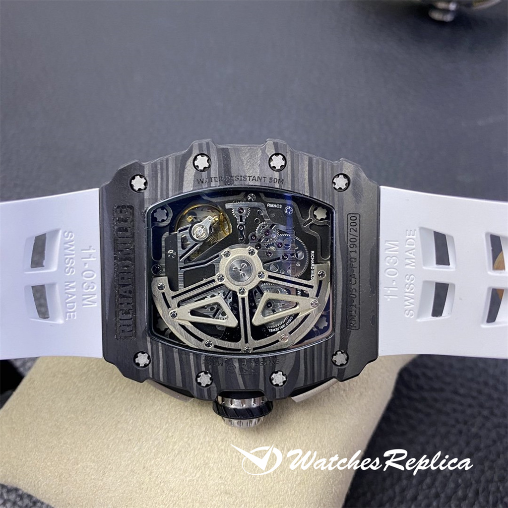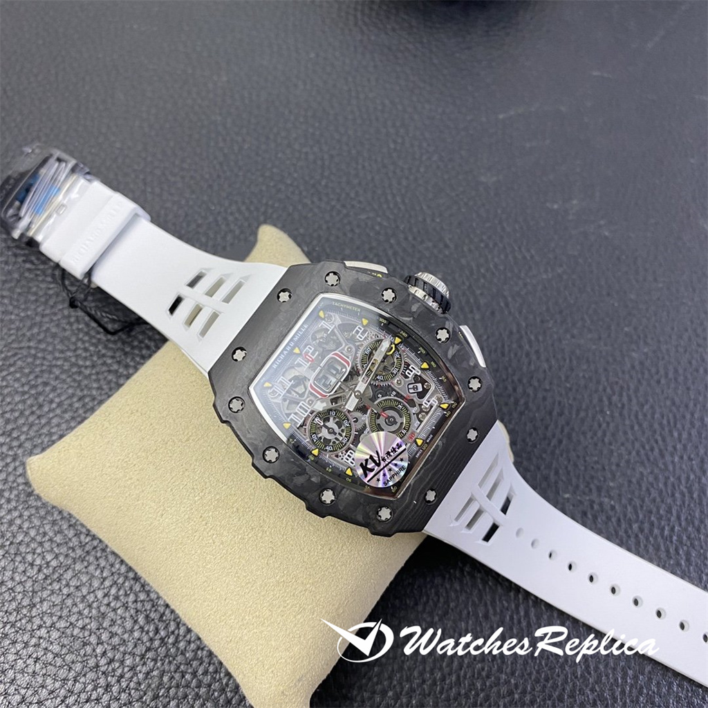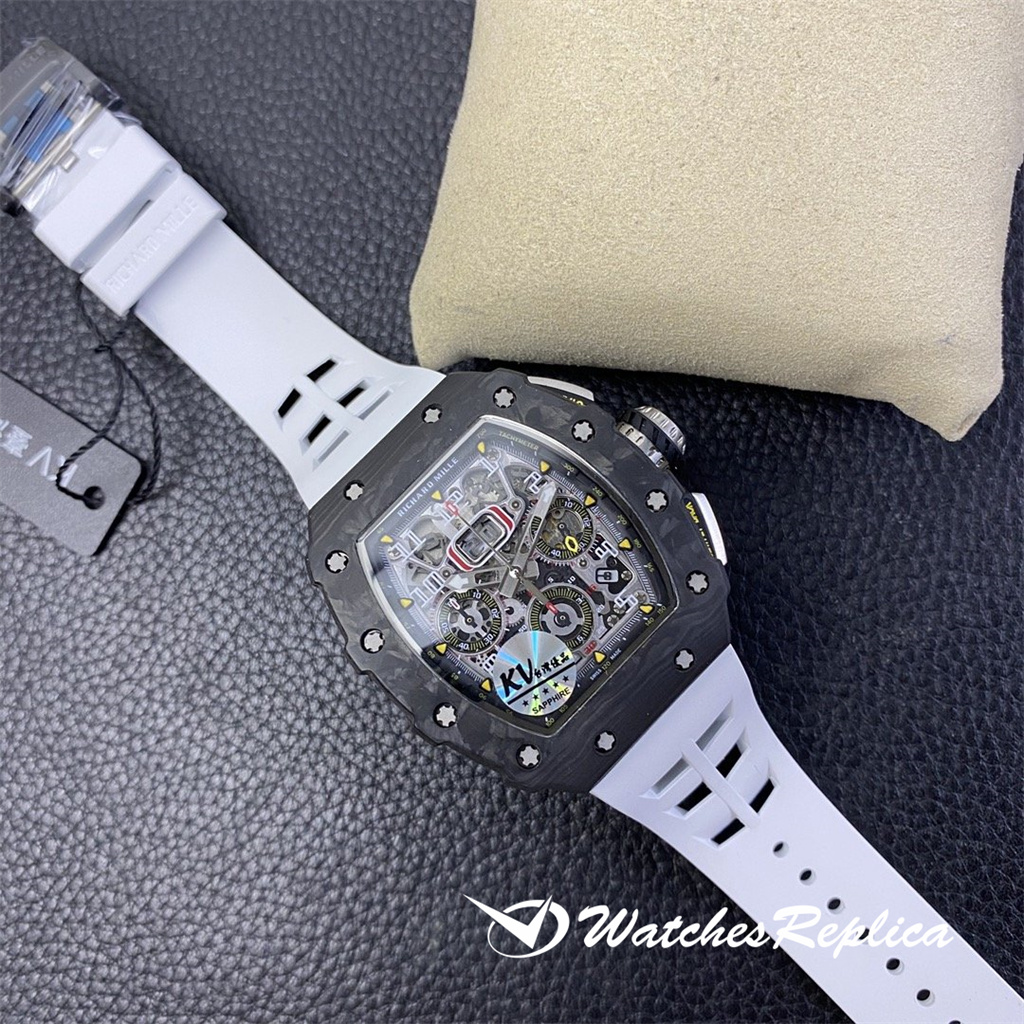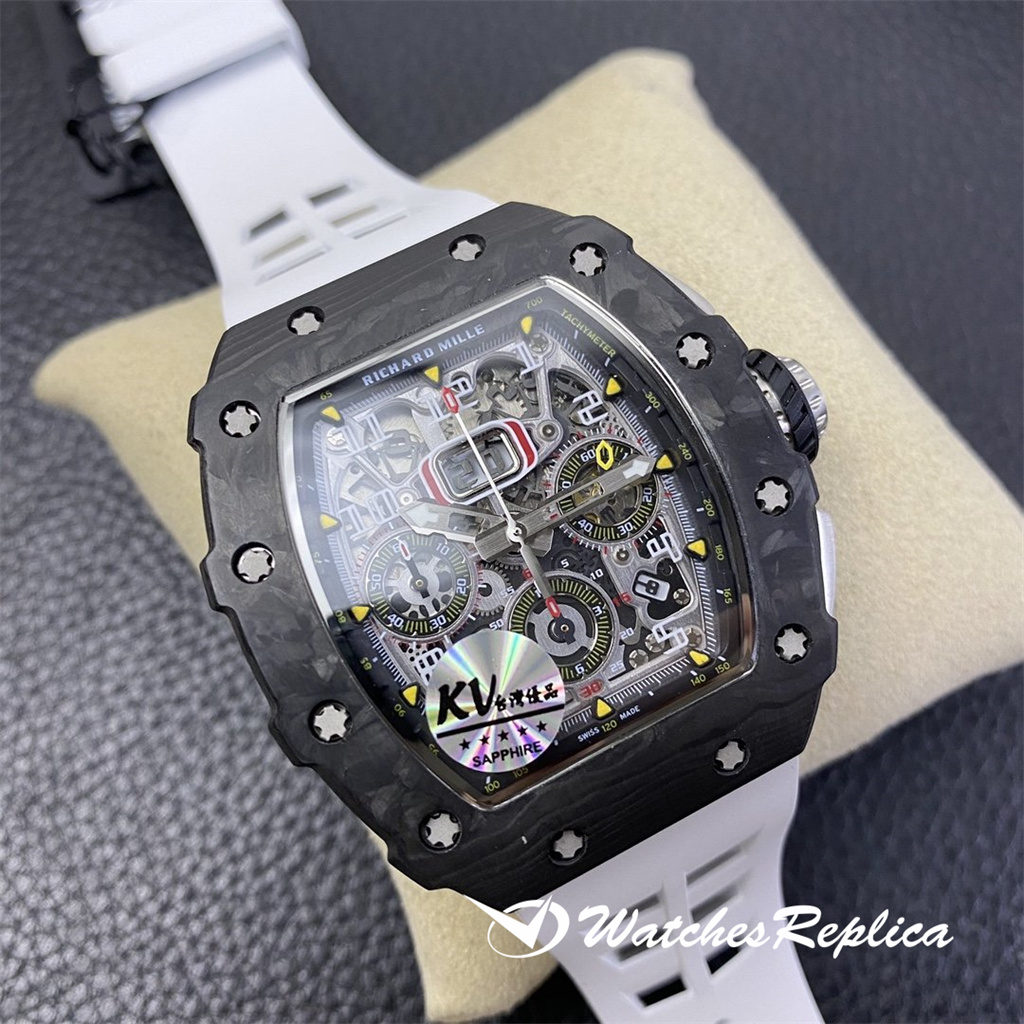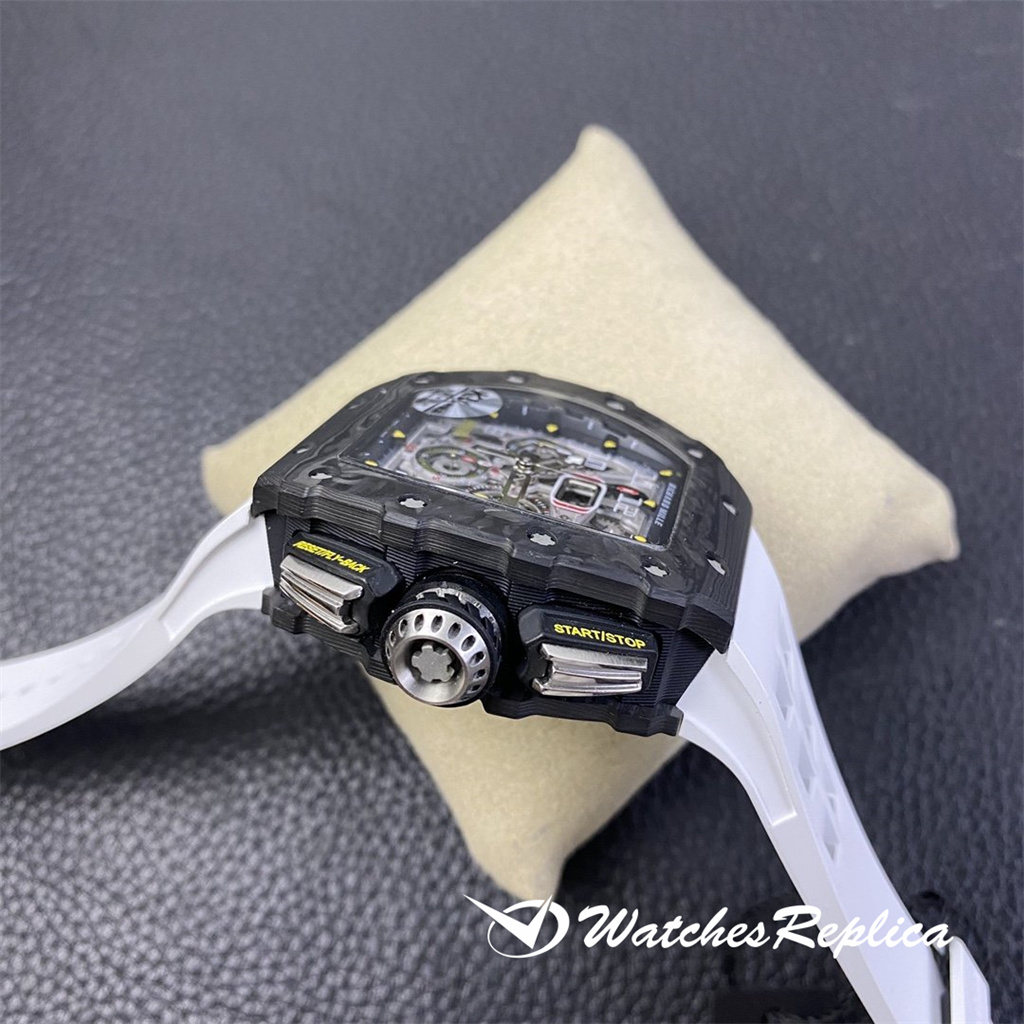 The overall design of the Richard Mille RM010 dial is classic white hollowed out, with Arabic numerals as hour markers, which is in sharp contrast with the black hollowed out dial. The rose gold case of the watch is gorgeous and extraordinary, and Richard Mille’s barrel shape is also very easy to identify. The rose gold frame with gray-black screws and black dial can highlight its cool and luxurious feeling. Diameter: 48*39.3mm Automatic mechanical titanium steel case sapphire crystal glass original rubber strap folding clasp.