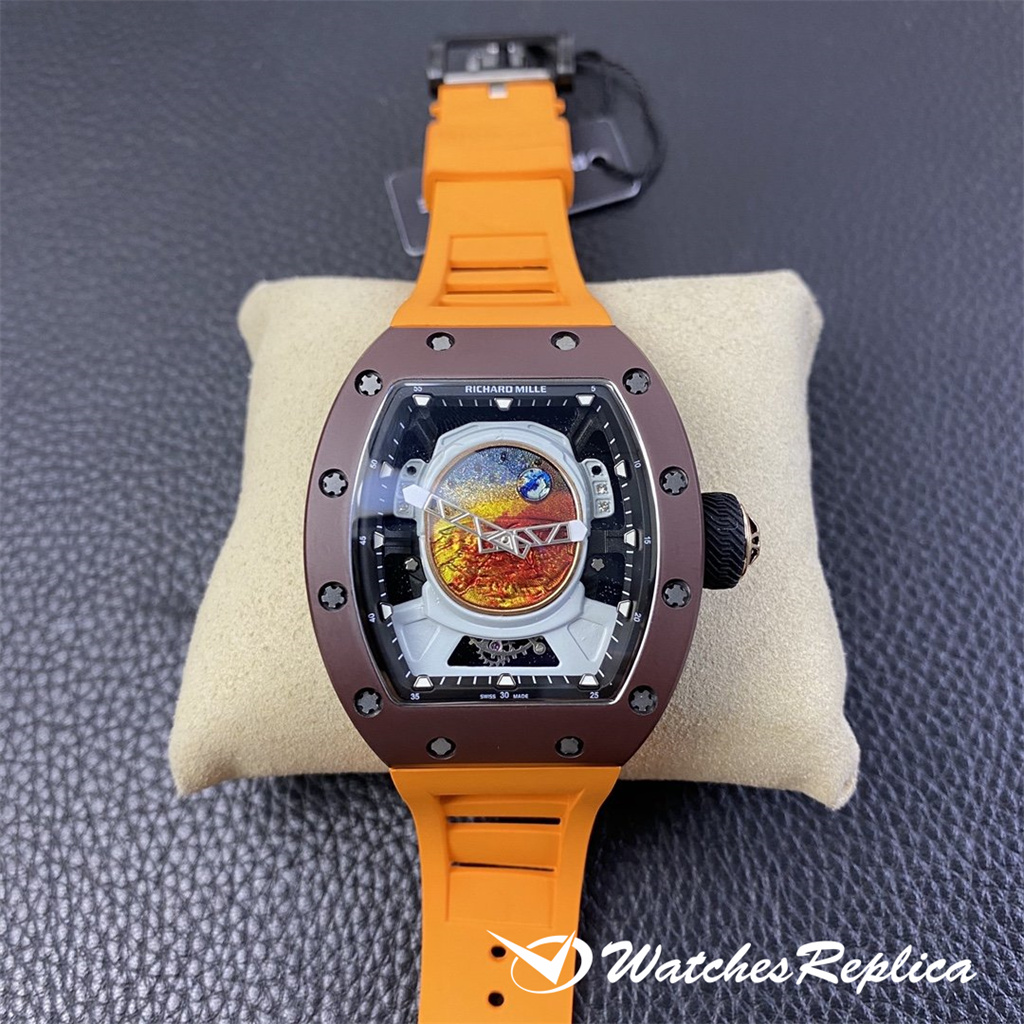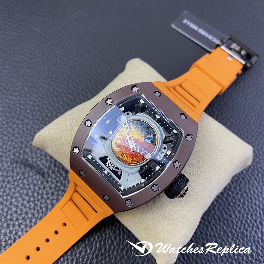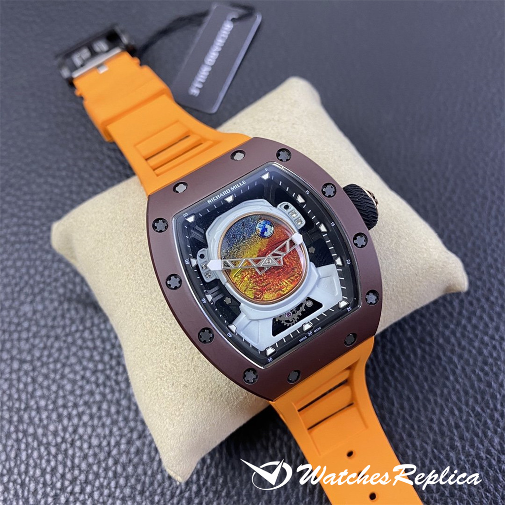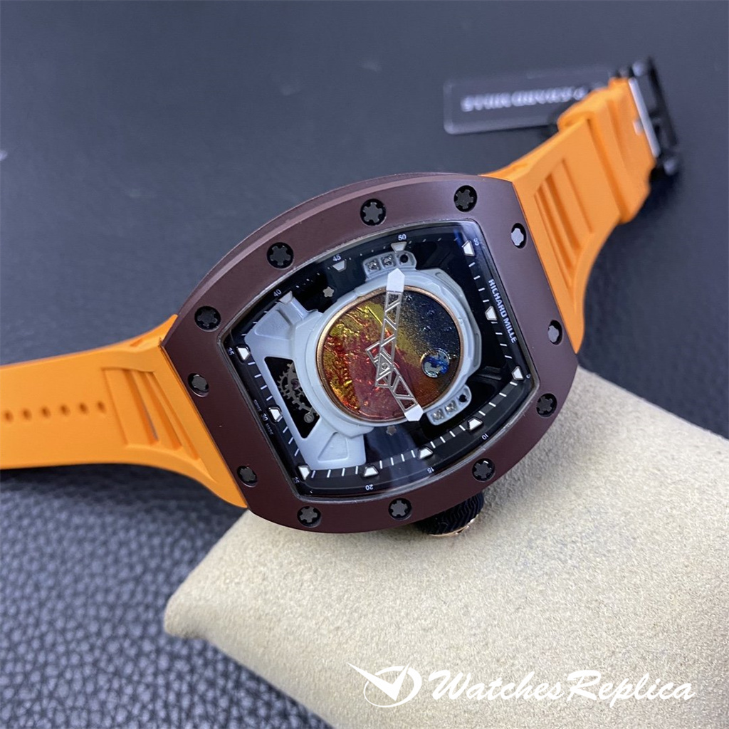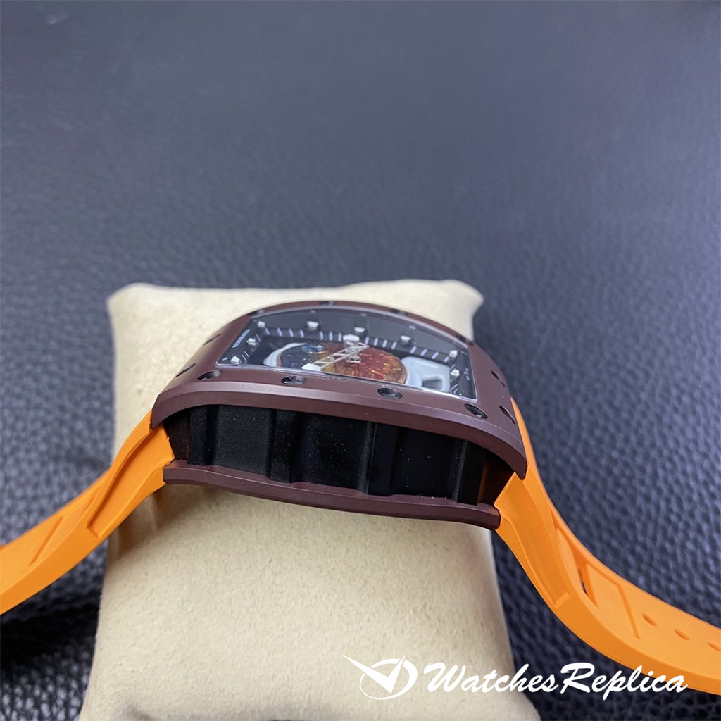 Richard Mille RM53-01 TPT carbon fiber watch is full of movement and vitality. The case is made of TPT carbon fiber, which is extremely strong, shock-resistant and damage-resistant. The unique corrugated luster of the carbon fiber and the sharp line of the case highlight the sporty style of this watch; through the anti-glare mirror, the suspension can be seen Skeleton movement, the movement is suspended in the case with 4 steel cables, which can withstand super strong external impact protection.