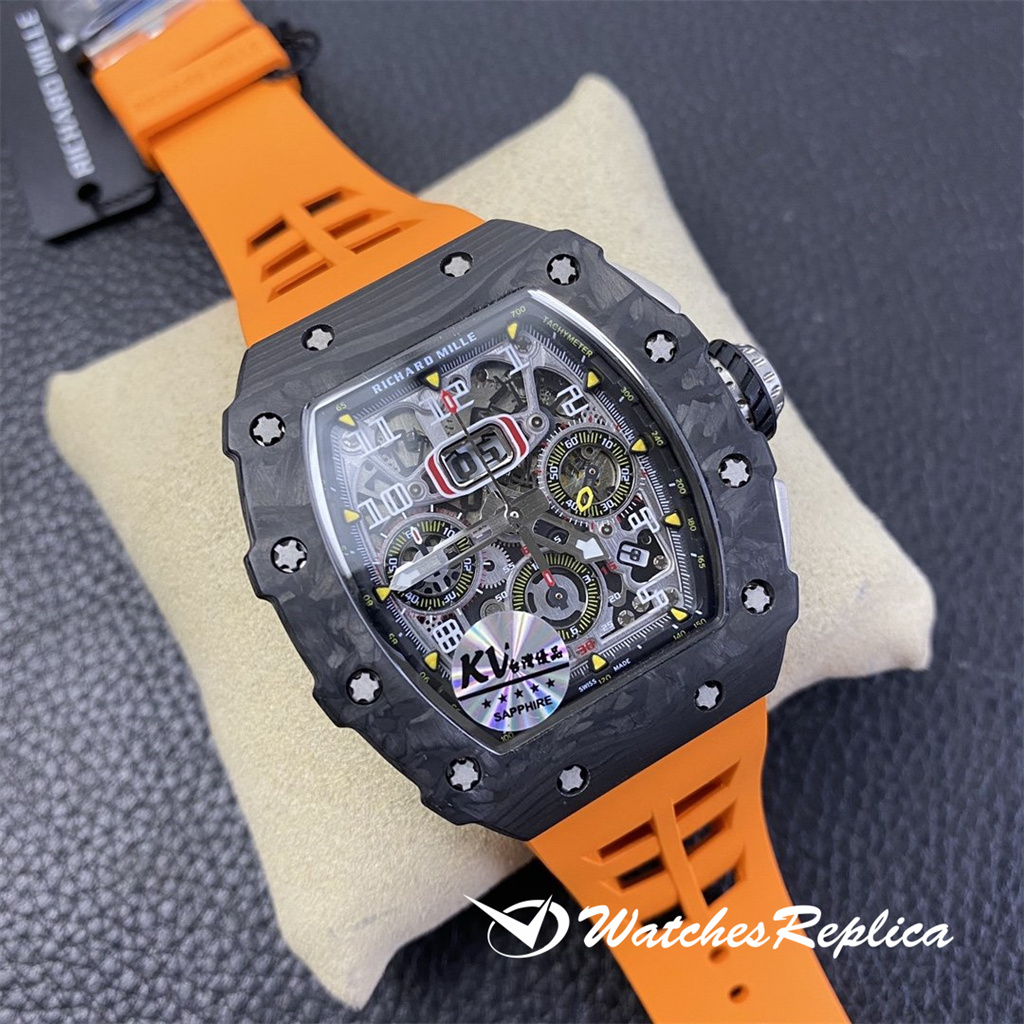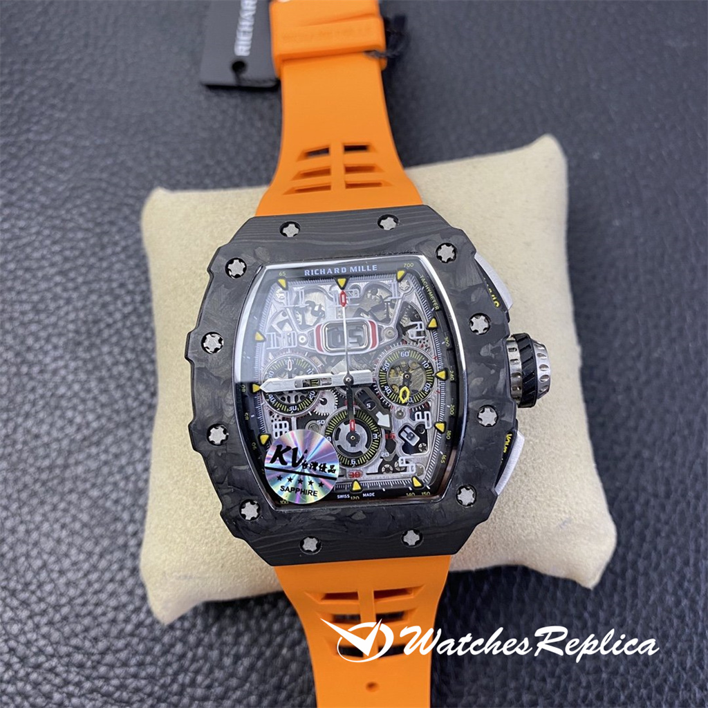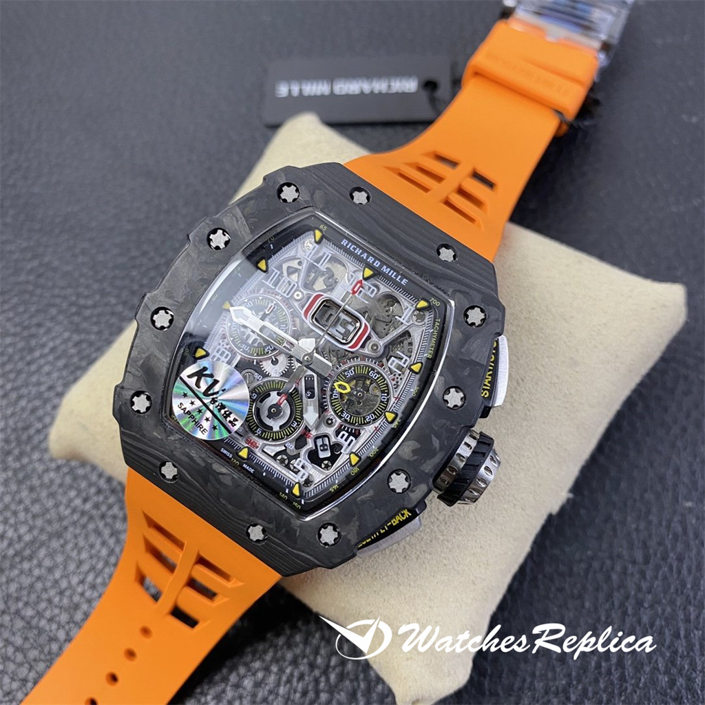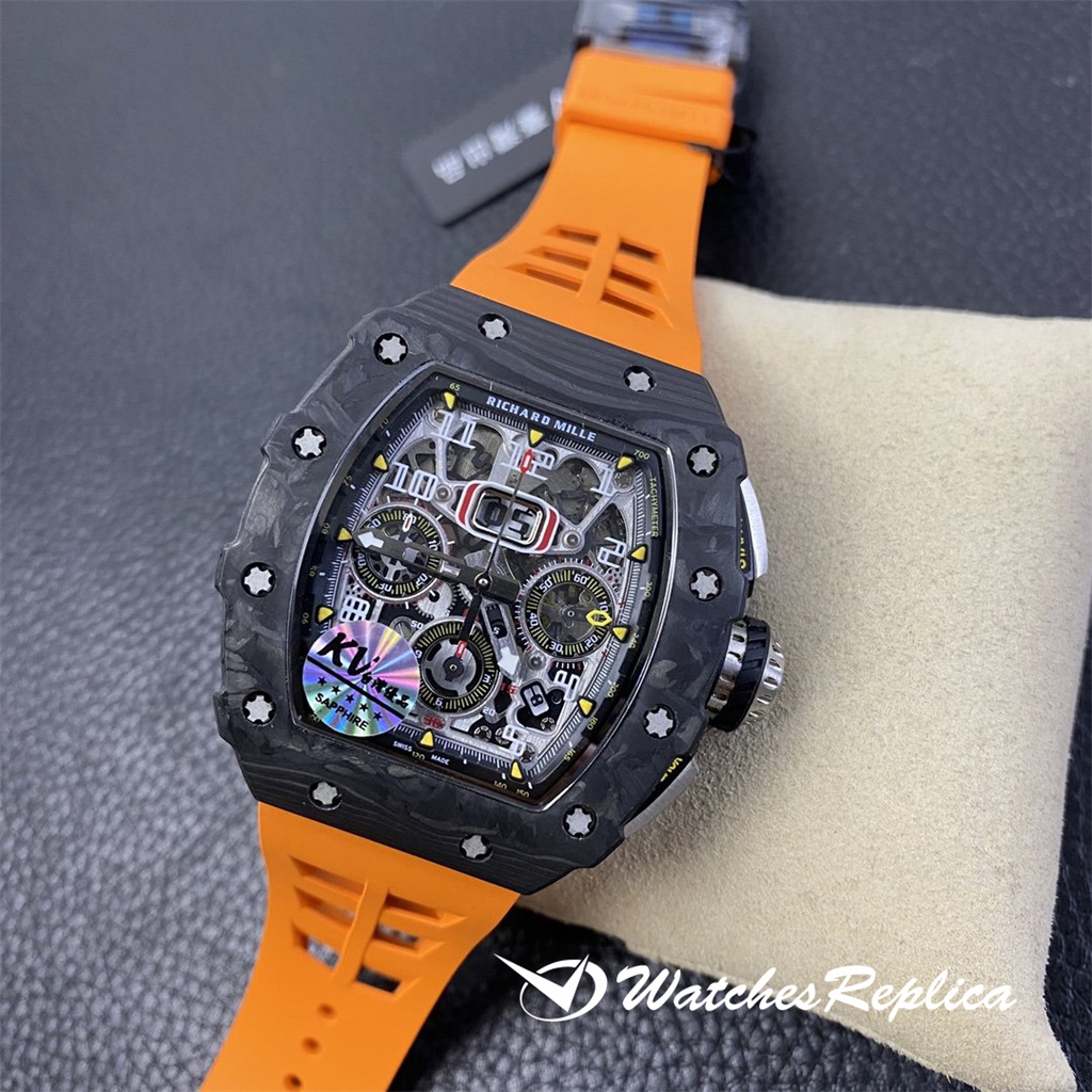 Richard Mille RM011 men’s watch, made of zirconia polycrystalline ceramics the same as the original, is strong, textured and wear-resistant. Original Shanghai 7750 automatic mechanical chronograph movement, copy the original data, open the mold, length 50*width 40 mm, original 1:1 barrel-shaped structure, rubber strap, transparent bottom