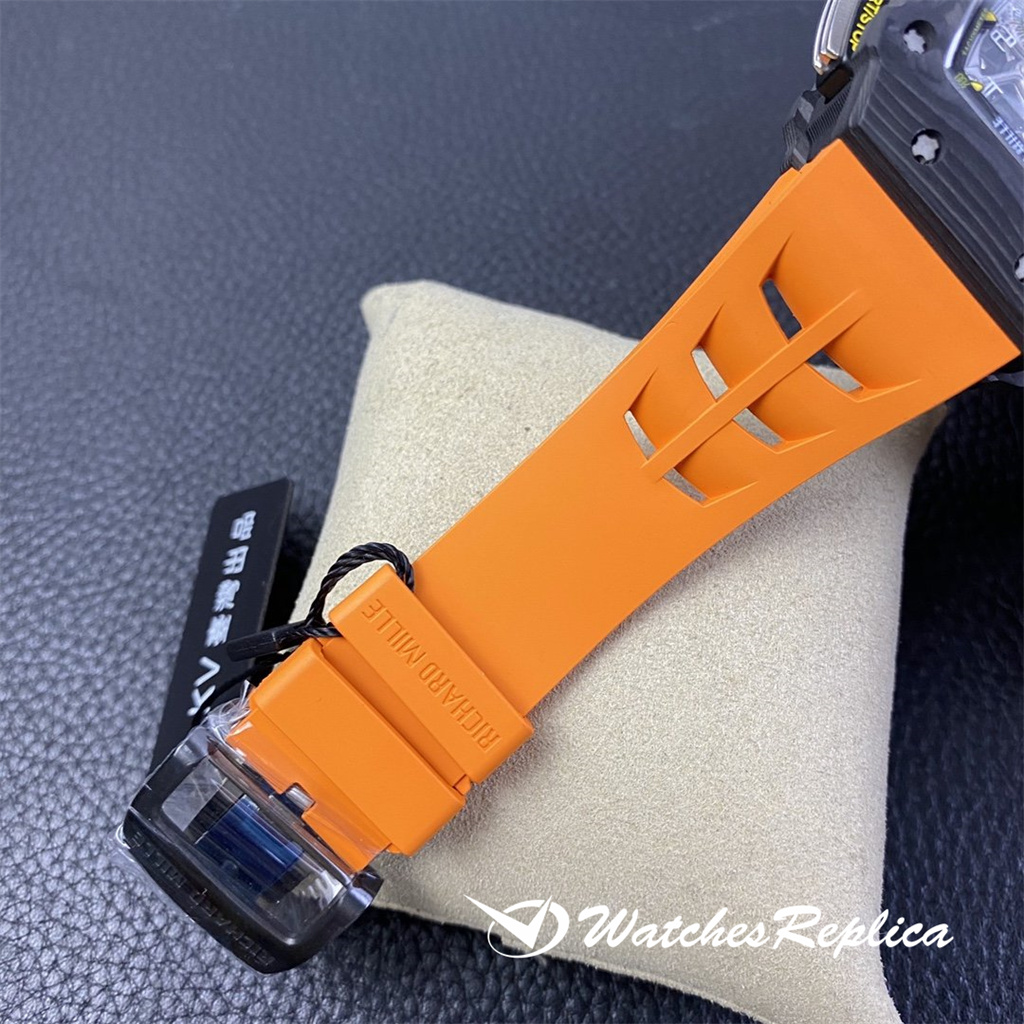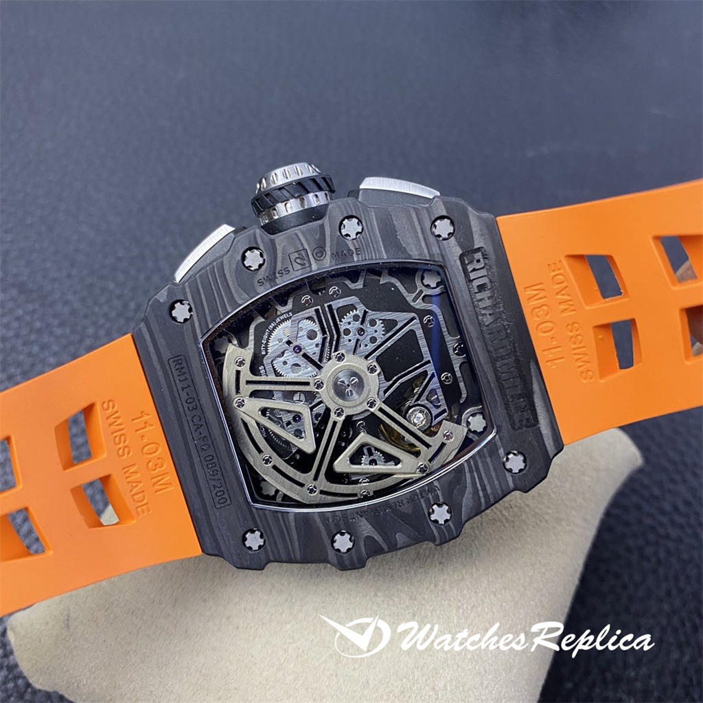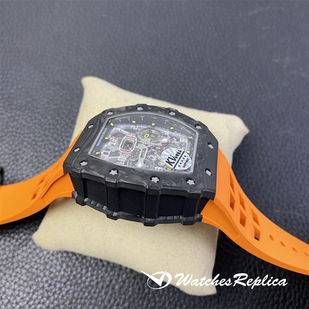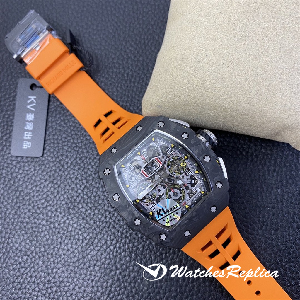 Richard Mille RM011 men’s watch, made of zirconia polycrystalline ceramics the same as the original, is strong, textured and wear-resistant. Original Shanghai 7750 automatic mechanical chronograph movement, copy the original data, open the mold, length 50*width 40 mm, original 1:1 barrel-shaped structure, rubber strap, transparent bottom