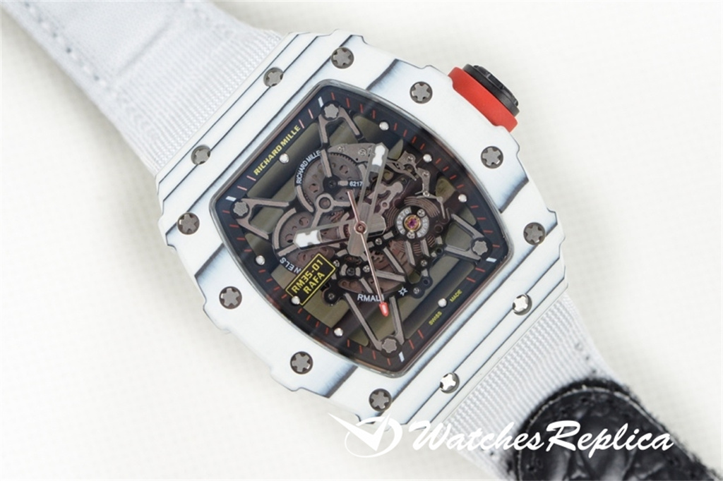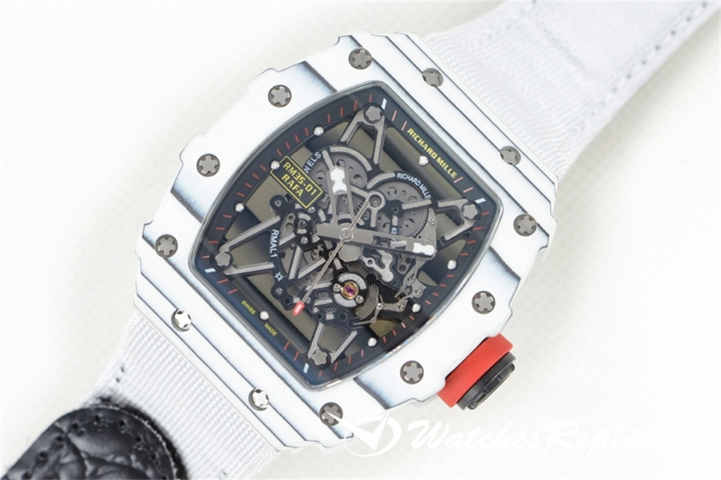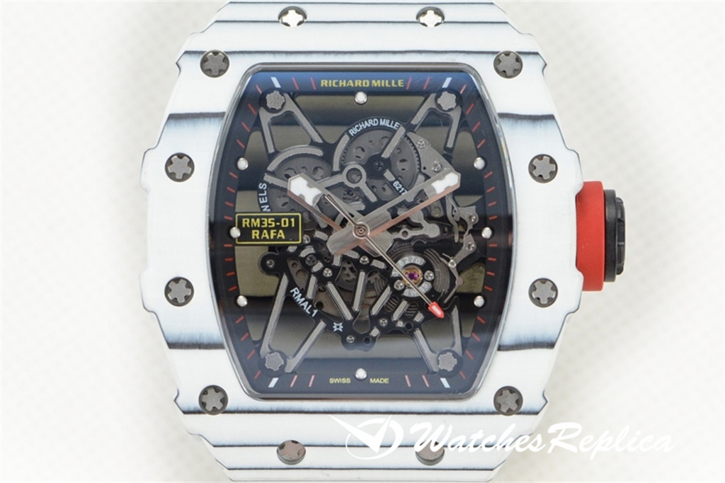 Richard Mille RM35-02 (Red Devil) full red carbon fiber series. This replica case and back cover use high-density imported NTPT carbon fiber material, carbon fiber case bottom and titanium liner on both sides. Machining with synchronous CNC! There is no gap between the upper and lower sides of the shell and the left and right sides. The rubber strap/nylon strap imported from Malaysia gives it a super tough and soft feeling. According to the original principle, the titanium metal material is used as the inner tank and the most cutting-edge electric Sparks cut into the air technology! Equipped with the original imported mechanical movement, sapphire crystal glass, the unique and exaggerated case dial design is just to meet you with unique personality