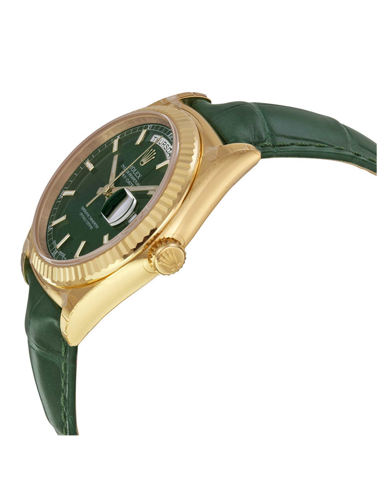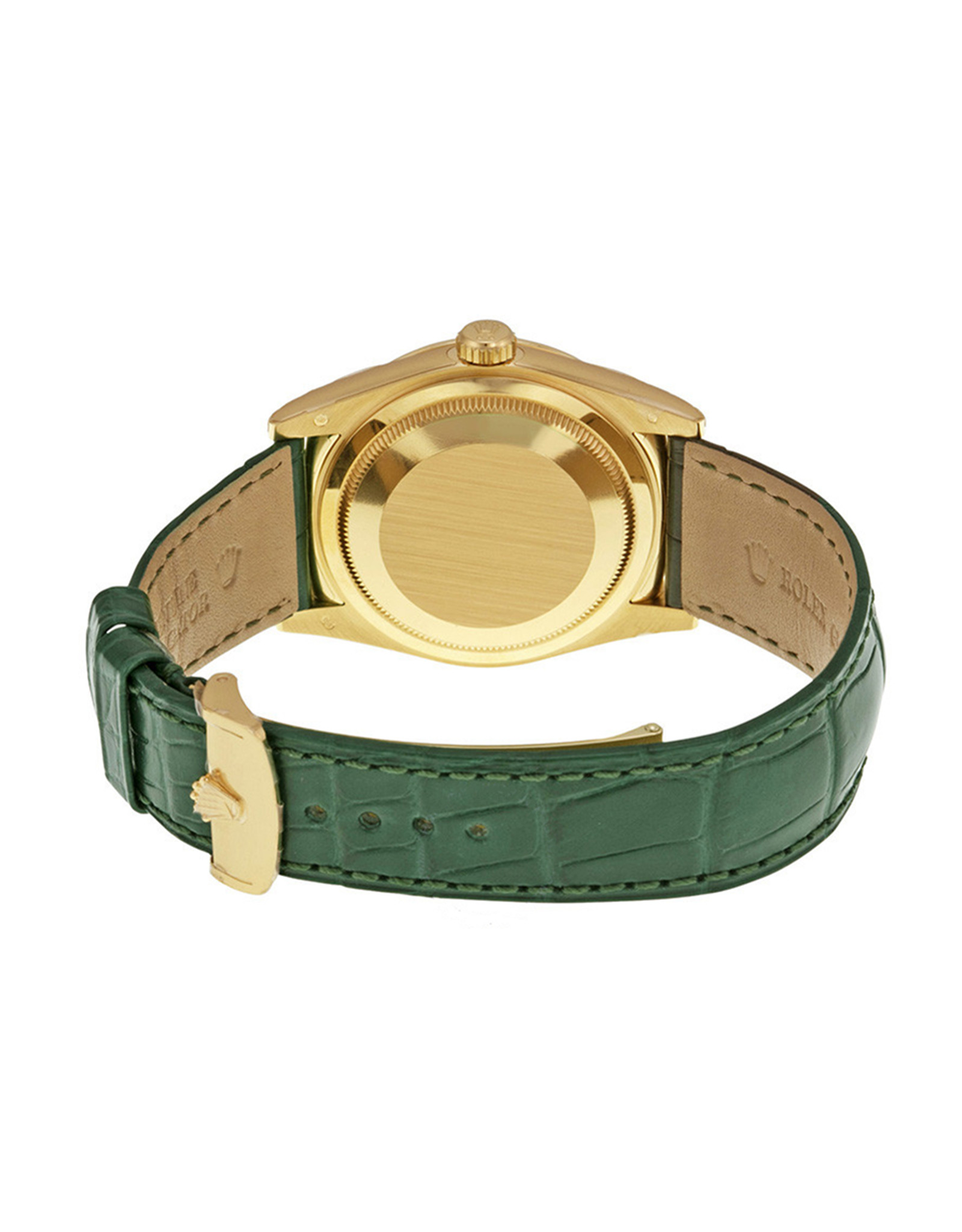 This Rolex Day-Date watch is lightweight and comfortable to wear, making it perfect for everyday use. You can even wear it while doing chores like cooking and laundry. The green leather strap and dial give it a stylish look that goes well with any outfit. The simple dial makes it easy to read the time, even at a glance.