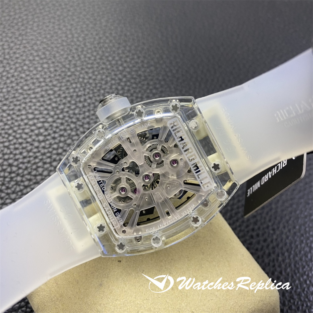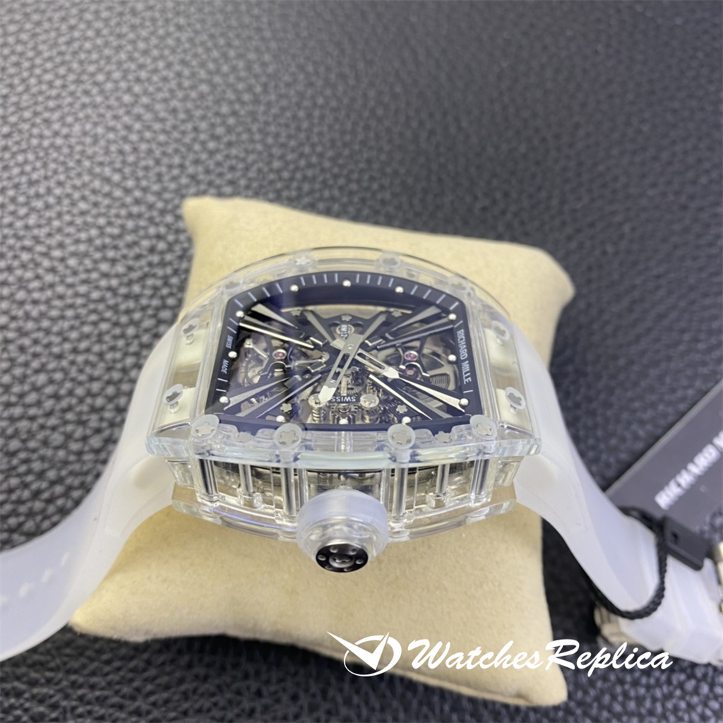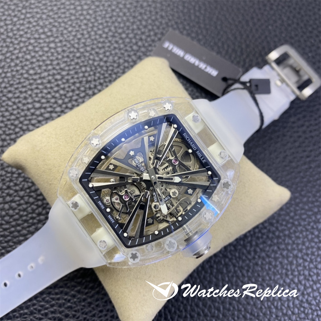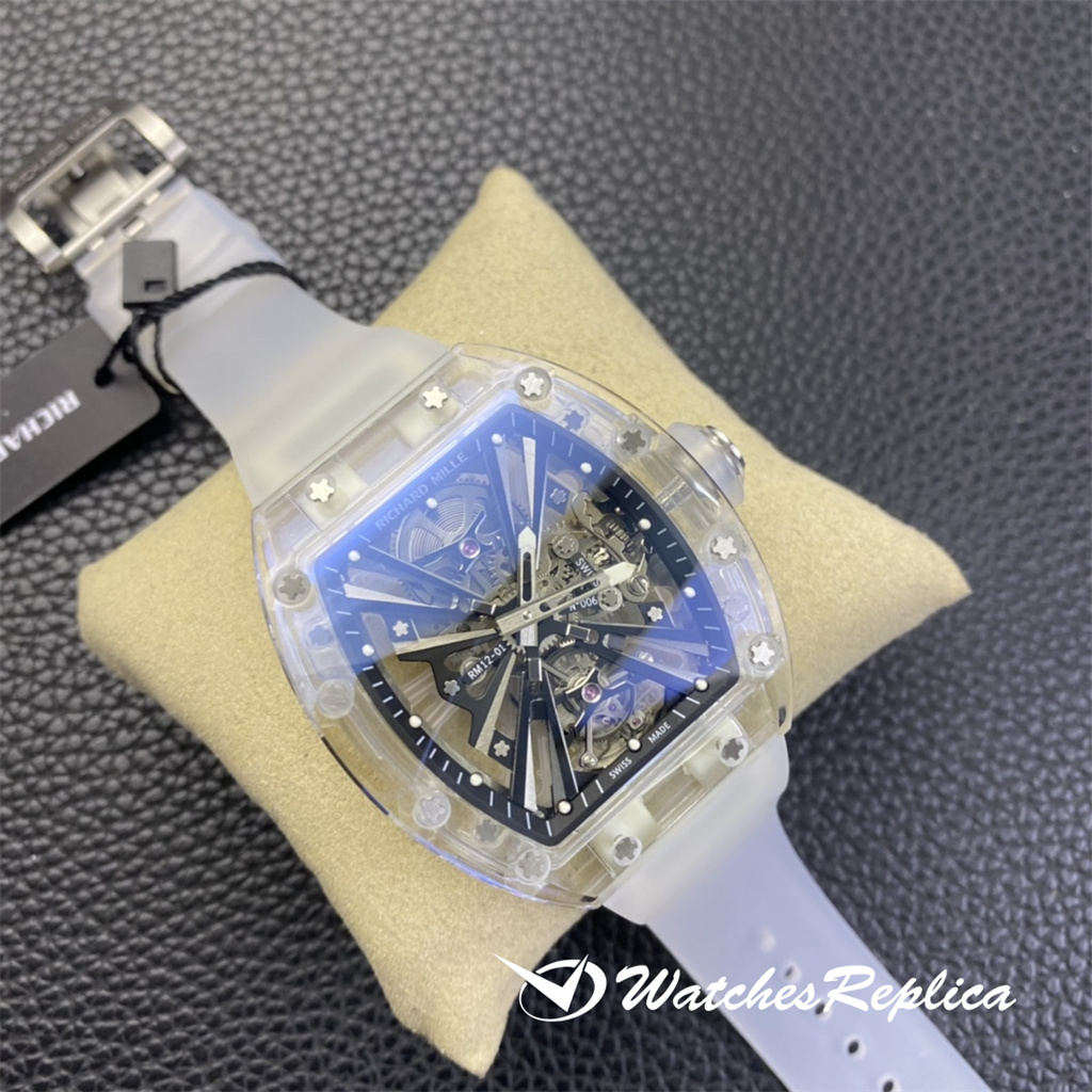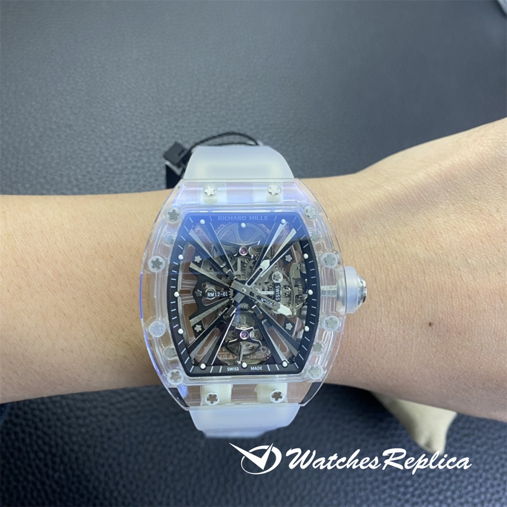 Richard Mille RM27-01 is equipped with imported mechanical movement. The size is 43*50mm. The case is made of TPT carbon fiber, which is extremely strong, shock-resistant and damage-resistant. The carbon fiber has a unique corrugated luster and sharp case lines. , Highlights the sporty style of this watch; through the anti-glare watch mirror, you can see the suspended hollow movement, which is suspended in the case and can withstand strong external impact protection.